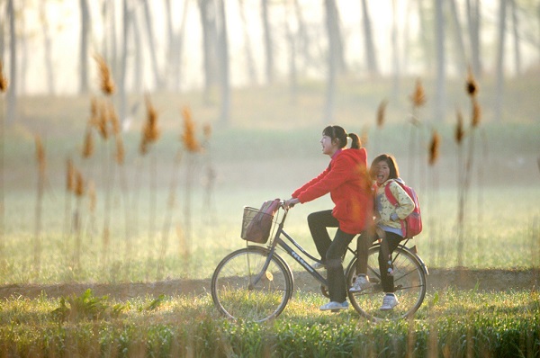 姊妹情深,相依相伴。放學(xué)路上,夕陽、麥浪、自行車、小鳥……奏響田園“交響曲”。