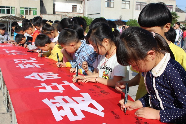 簽下安全承諾,快樂過六一。王店小學(xué)全體師生在寫有“珍愛生命,牢記六個不,預(yù)防溺水”紅色宣傳橫幅上神圣地簽下自己的名字。